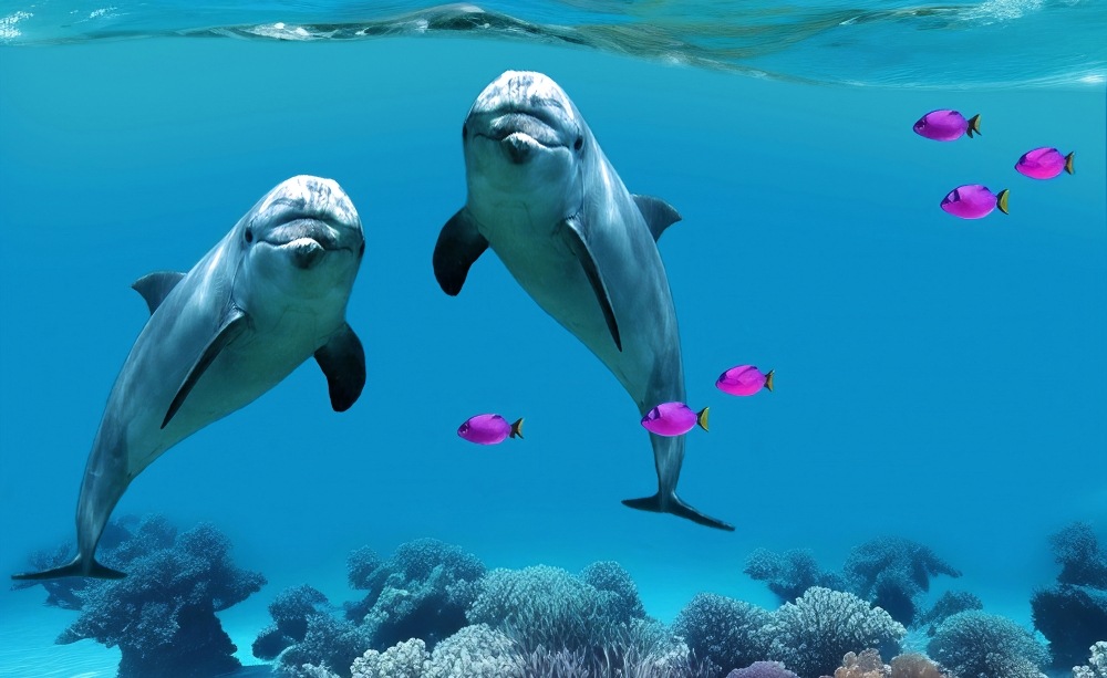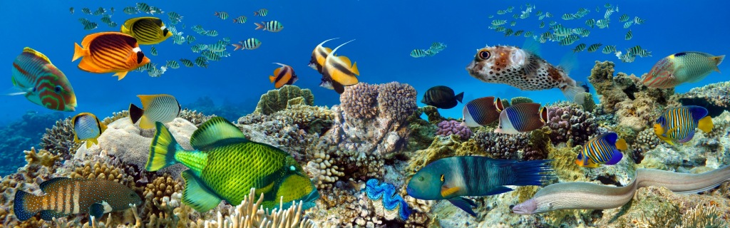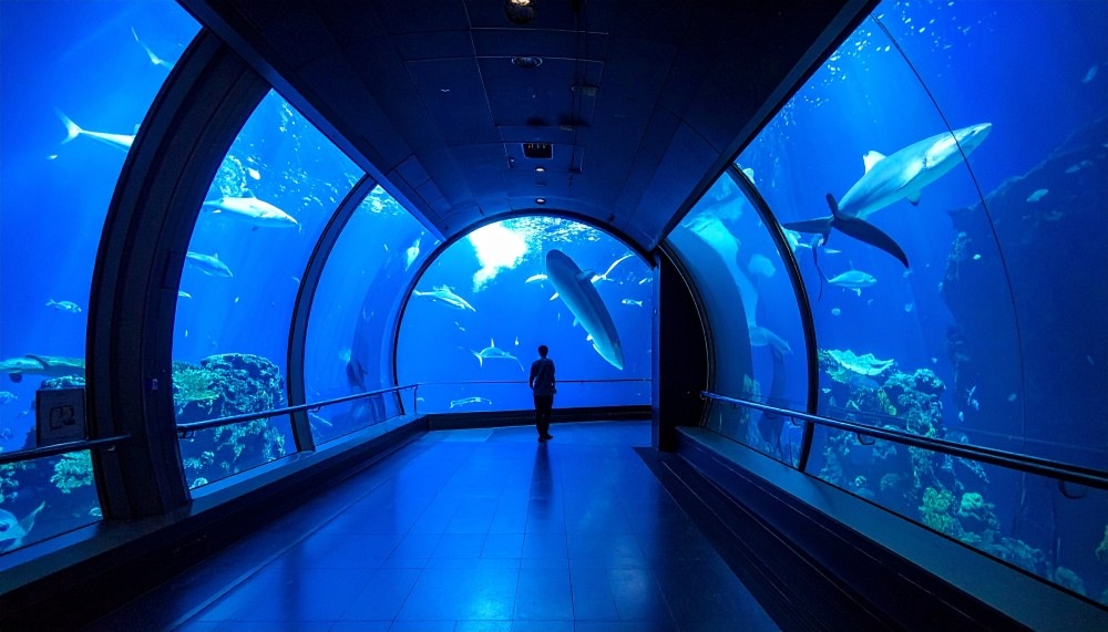 頭上をエイやサメが泳ぎ抜ける大パノラマ。
